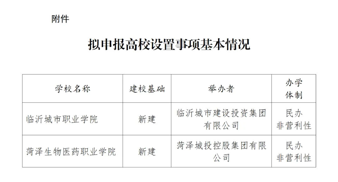 3月18日,山東省教育廳網站發布關于擬申報高校設置事項的公示,對擬申報的2個專科層次高等職業學校設置事項進行公示,擬新建臨沂城市職業學院、菏澤生物醫藥職業學院兩所民辦非營利性高等職業學校。
