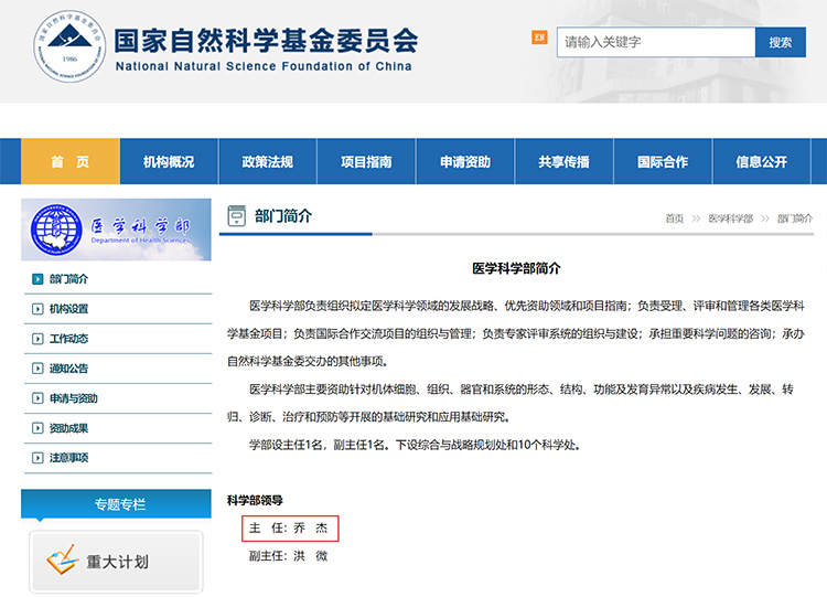 國家自然科學基金委員會官方網站顯示,喬杰院士已擔任國家自然科學基金委員會醫學科學部主任。