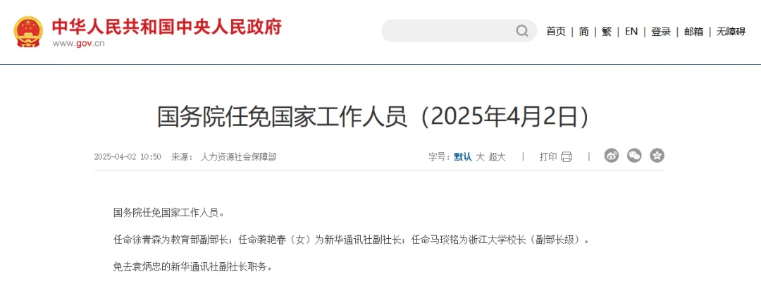 任命徐青森為教育部副部長;任命襲艷春(女)為新華通訊社副社長;任命馬琰銘為浙江大學校長(副部長級)。免去袁炳忠的新華通訊社副社長職務。
