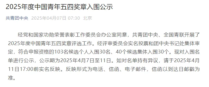 經黨和國家功勛榮譽表彰工作委員會辦公室同意,共青團中央、全國青聯開展了2025年度中國青年五四獎章評選工作。經評審委員會實名投票和團中央書記處集體審定,符合申報資格的103名候選個人入圍30名、40個候選集體入圍30個。