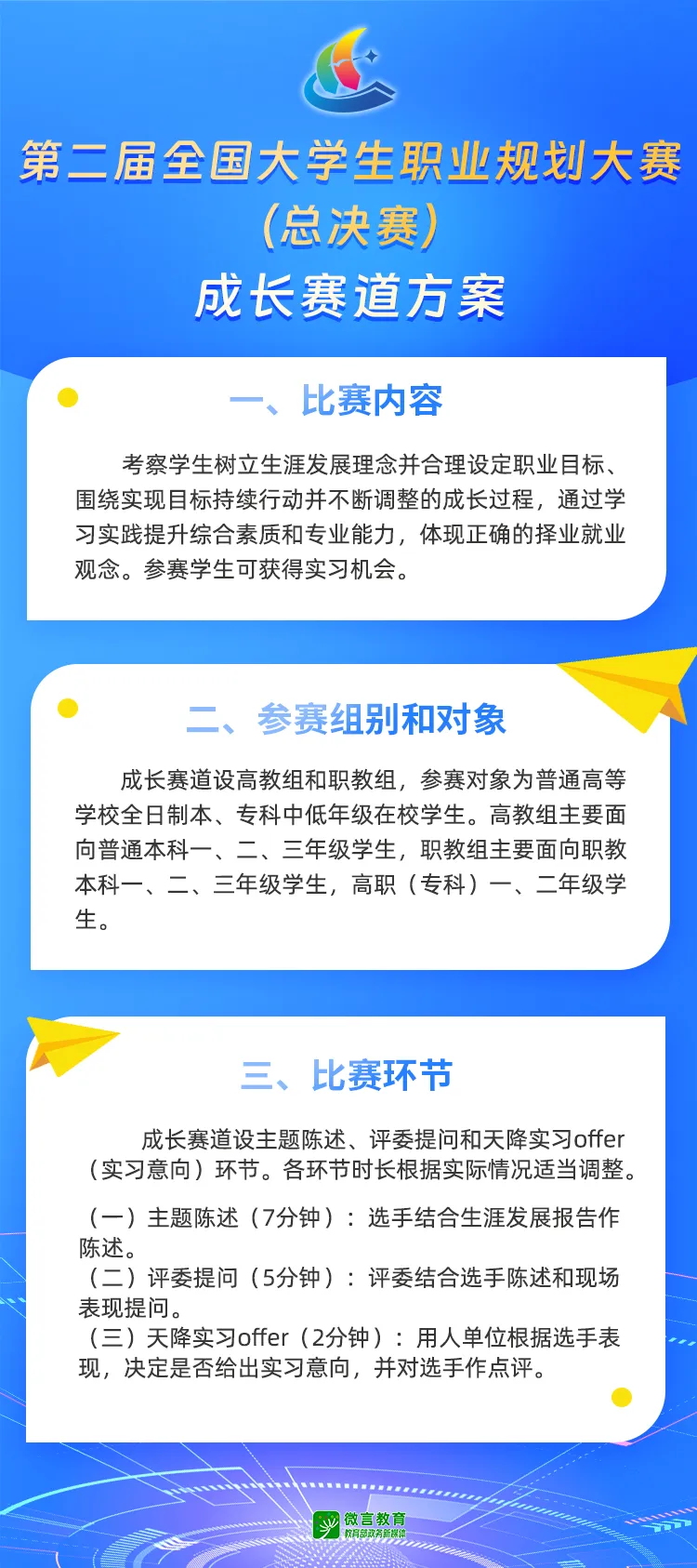 大賽總決賽學生成長賽道高教組、職教組將在湖南大學舉行,主要考察學生樹立生涯發展理念并合理設定職業目標、圍繞實現目標持續行動并不斷調整的成長過程,通過學習實踐提升綜合素質和專業能力,體現正確的擇業就業觀念,參賽學生可獲得實習機會。