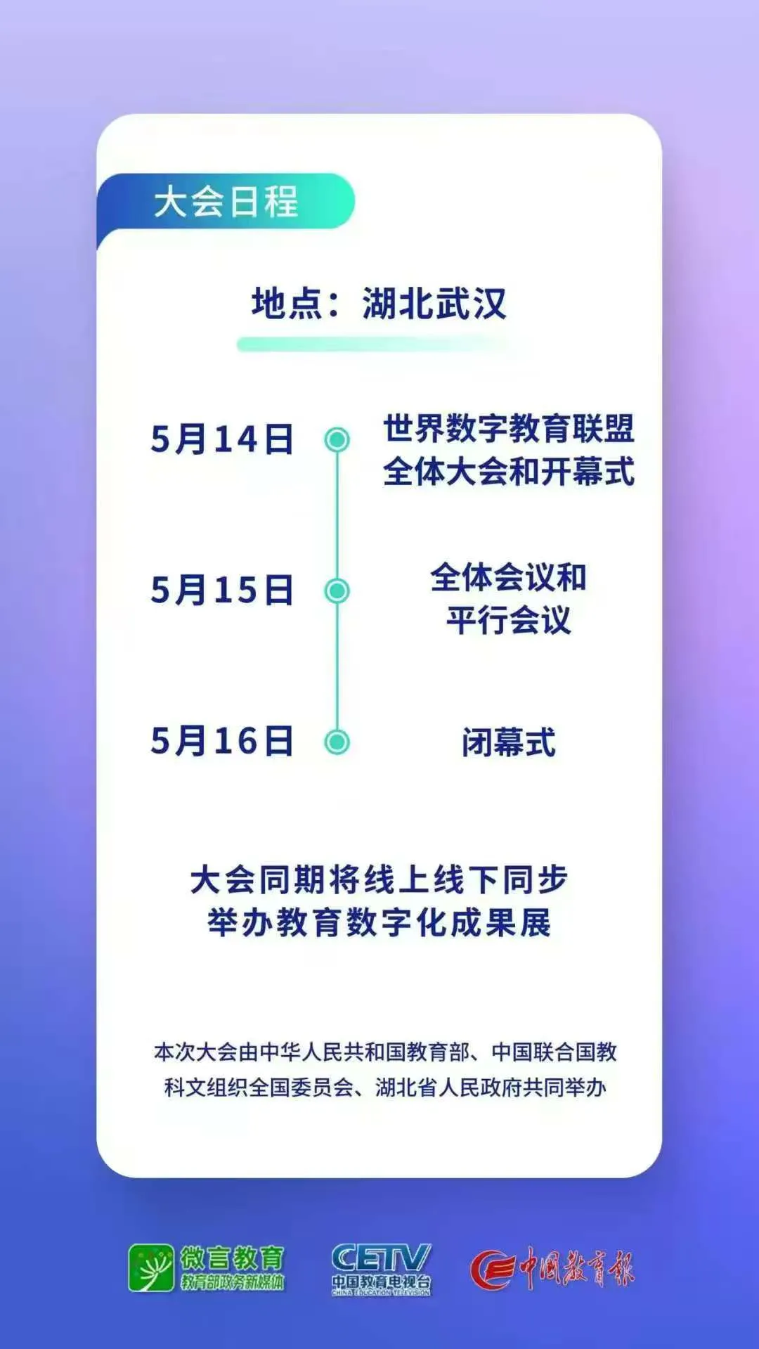 本次大會由中華人民共和國教育部、中國聯合國教科文組織全國委員會、湖北省人民政府共同舉辦。據悉,教育部于2023年和2024年成功舉辦兩屆世界數字教育大會并發布一系列務實成果,包括成立世界數字教育聯盟、推出智慧教育平臺、發布全球數字教育發展指數等。