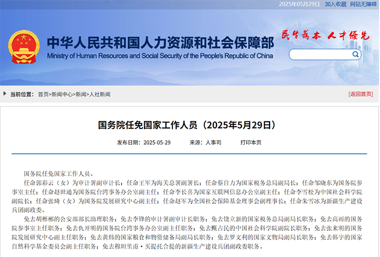 人社部網站5月29日消息,國務院任免國家工作人員。其中:李雪松任中國社會科學院副院長。