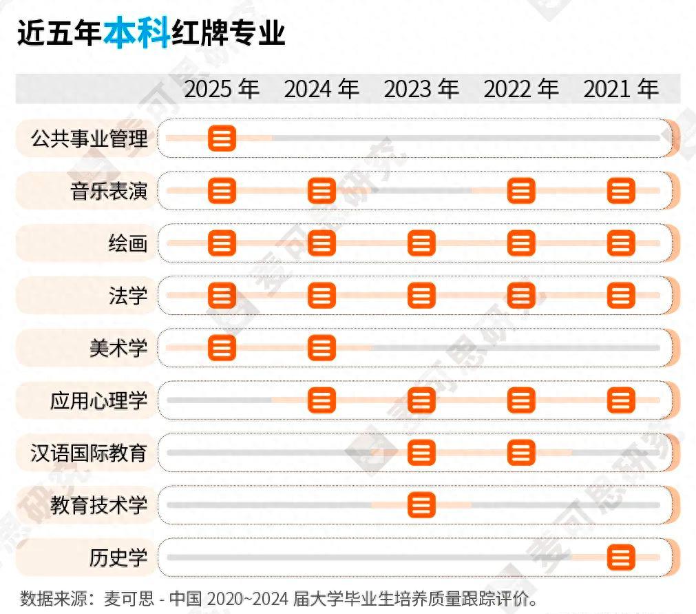 從近五年本科紅牌專業榜單來看,法學、繪畫連續五年被列為紅牌專業。音樂表演、應用心理學五年上榜4次,公共事業管理今年首次上榜,需加以重點關注。