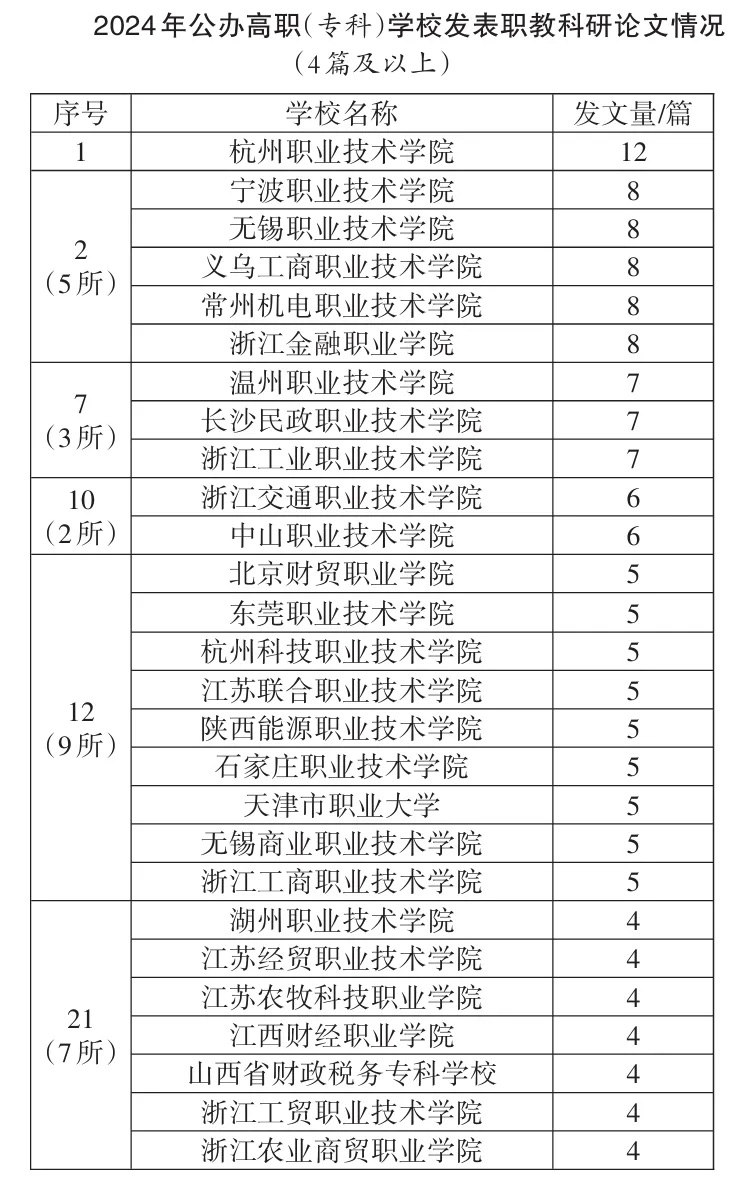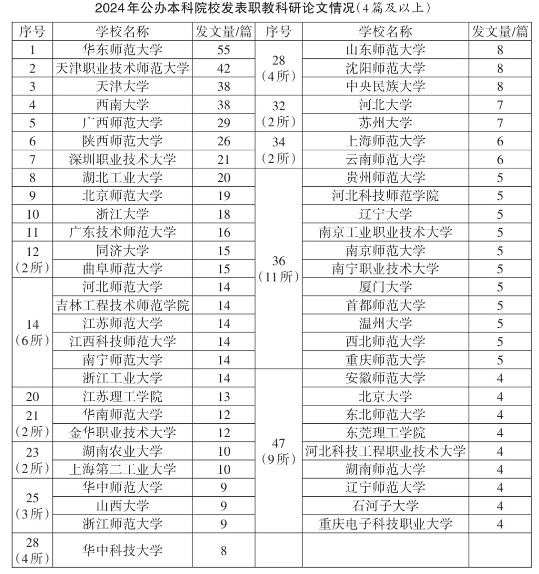 2024年職業教育科研高貢獻機構中普通本科高校有:華東師范大學、天津職業技術師范大學、天津大學、西南大學、廣西師范大學、陜西師范大學、湖北工業大學、北京師范大學、浙江大學、廣東技術師范大學等;職業教育類高校有:深圳職業技術大學、金華職業技術大學、杭州職業技術大學、寧波職業技術學院、無錫職業技術學院、義烏工商職業技術學院、常州機電職業技術學院、浙江金融職業學院、溫州職業技術學院、長沙民政職業技術學院、浙江工業職業技術學院等(后3所高職院校數據并列)。