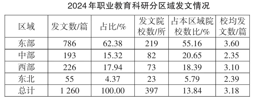 《中國高教研究》編輯部近日推出《中國職業教育研究進展與熱點評析——2024年全國高校職業教育科研論文統計分析》一文,通過對發表在27家教育類中文核心期刊上的1440篇職業教育科研論文的統計和分析發現,公辦本科院校的發文貢獻比例遠高于公辦高職(專科)學校,“雙一流”建設高校和“雙高計劃”建設學校是職業教育科研論文的主要產出力量。東部區域的發文量、機構科研活動參與度均明顯高于其他區域。職業教育科研已形成了區域集聚中心,產生了具有學術引領力的研究機構。
