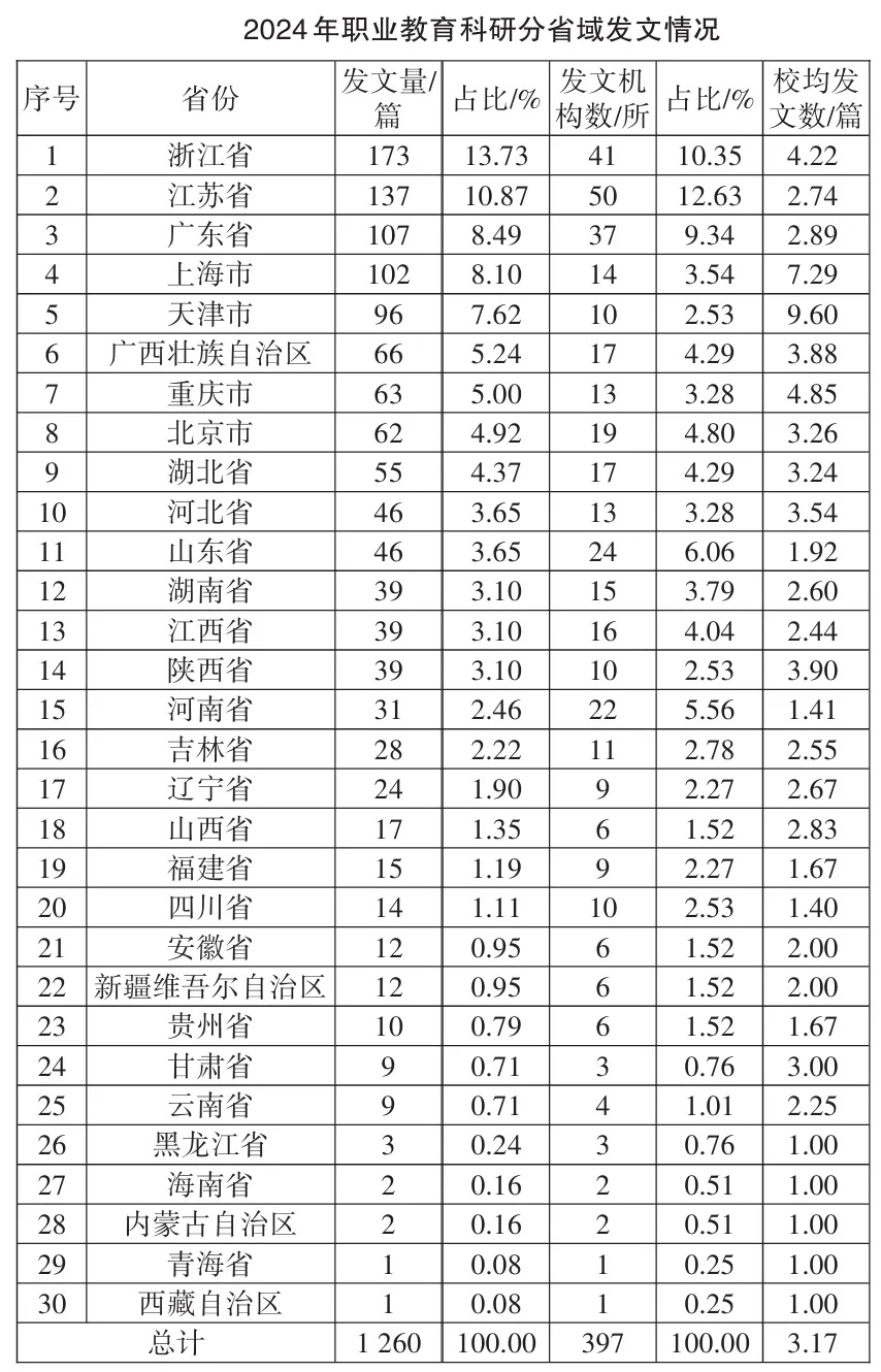從區域分布上看:2024年東部地區繼續保持領先優勢,將數據比較的范圍細化至省域層面可以發現,高貢獻區域有浙江、江蘇、廣東、上海、天津、廣西、重慶、北京、湖北、山東、河北11個省(區、市)(山東、河北數據并列)。由此可見,我國職業教育科研生態已形成由上述區域組成的職教科研集聚中心。該中心與其區域內職業教育發展的水平形成了一定的呼應關系,即產業興盛的地區支撐了發達的職業教育,同時,也支撐了高質量的職業教育研究。