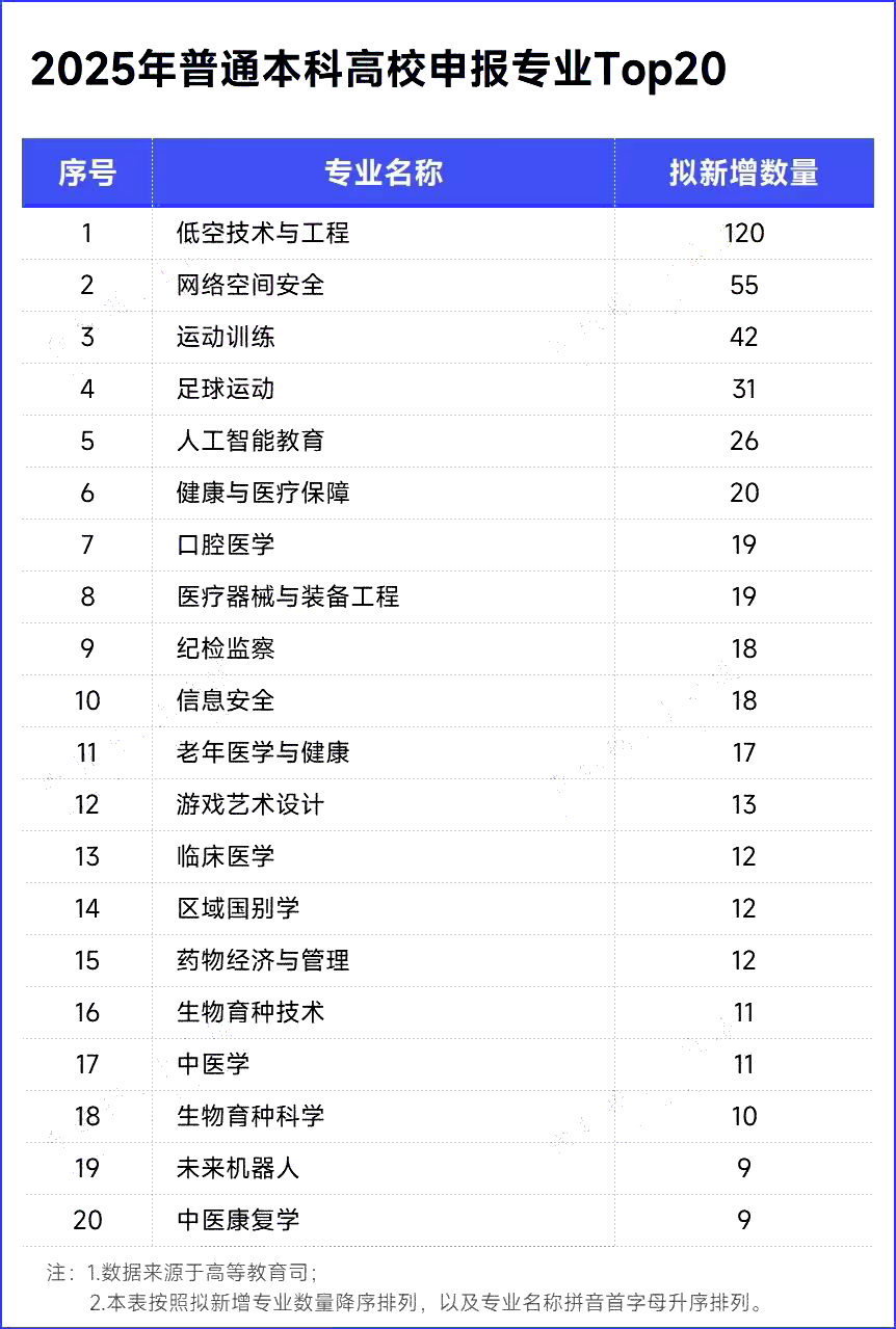 經統計,本次申報專業擬新增863個。從申報的專業類型來看,2025年度共申報239種專業。其中,低空技術與工程擬新增數量最多,為120個;網絡空間安全次之,擬新增數量為55個。