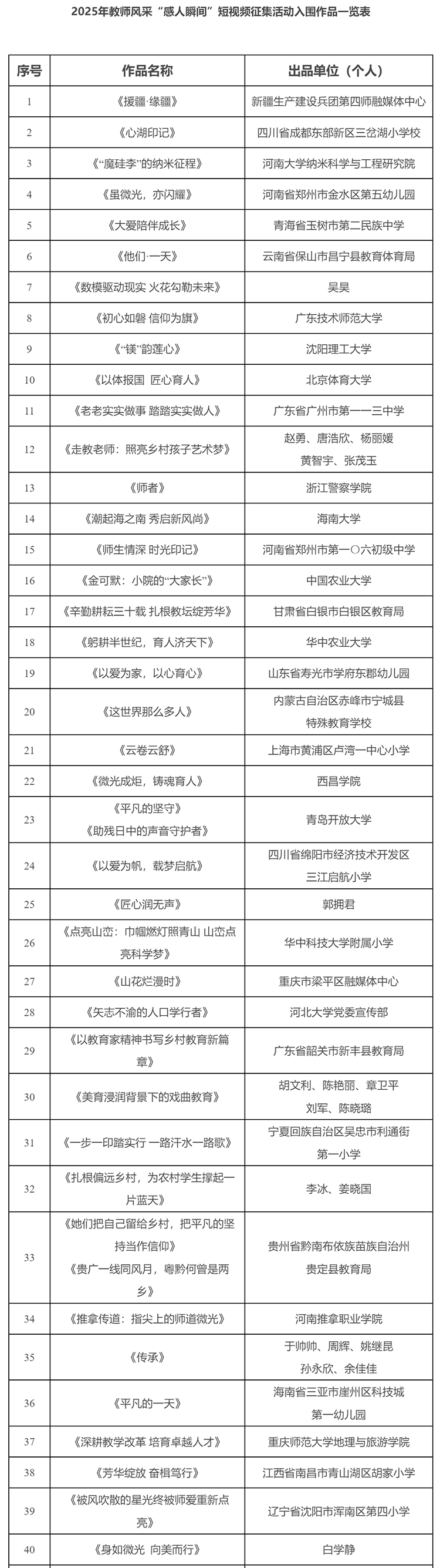 2025年教師風采“感人瞬間”短視頻征集活動優勝作品和入圍作品名單