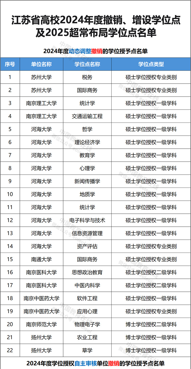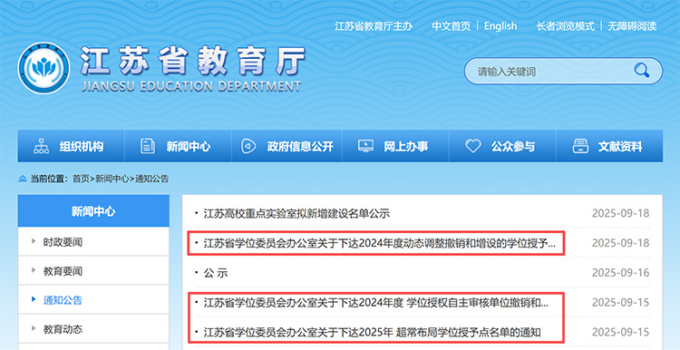 近日,江蘇省學位委員會辦公室公開《江蘇省學位委員會辦公室發布關于下達2024年度學位授權自主審核單位撤銷和增設的學位授予點名單的通知》《江蘇省學位委員會辦公室關于下達2025年超常布局學位授予點名單的通知》《江蘇省學位委員會辦公室關于下達2024年度動態調整撤銷和增設的學位授予點名單的通知》。
