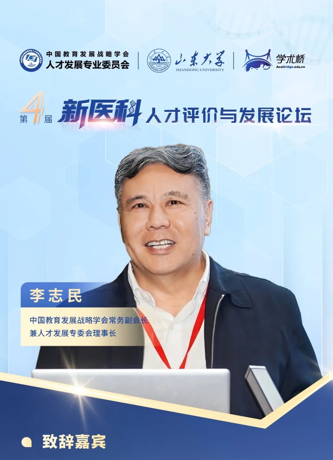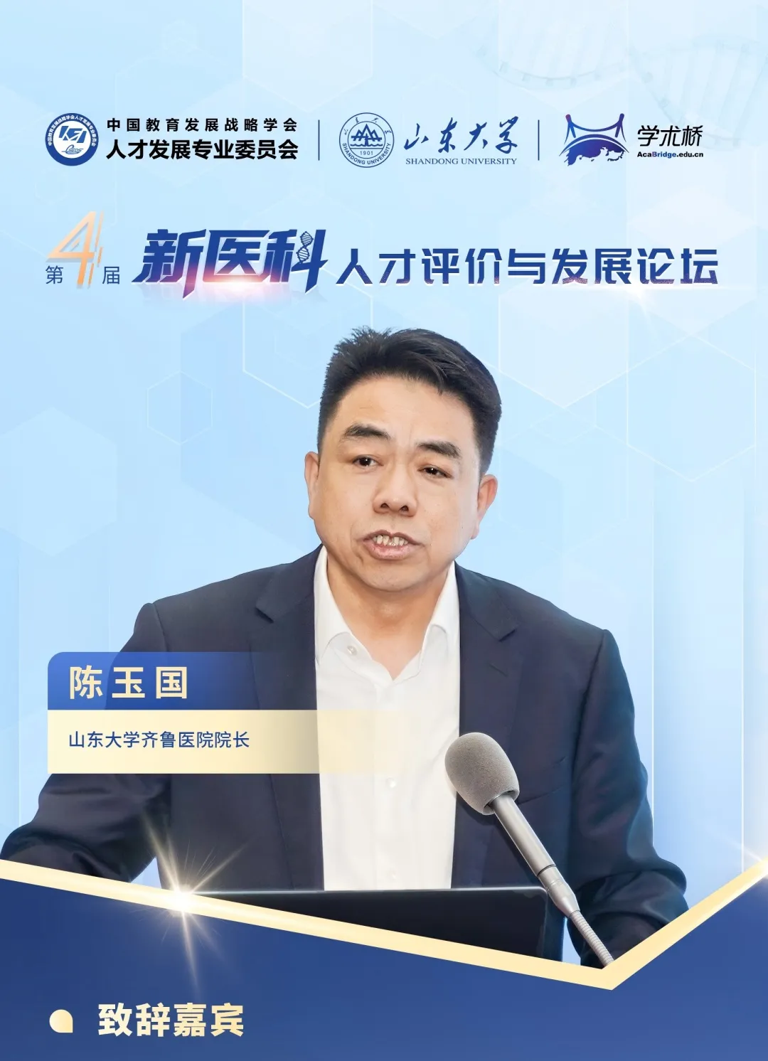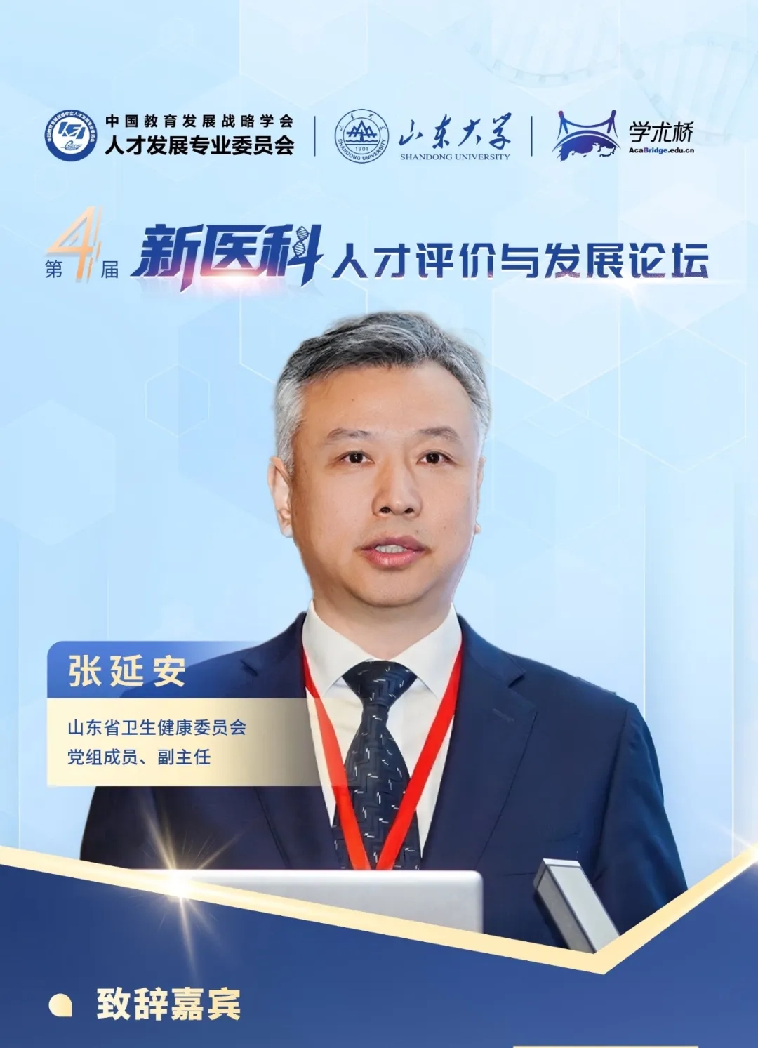 論壇開始,山東大學黨委常委、常務副校長吳臻,中國教育發展戰略學會常務副會長兼人才發展專委會理事長李志民,山東省委教育工委委員、省教育廳黨組成員、副廳長王浩,山東省衛生健康委員會黨組成員、副主任張延安,山東省委組織部人才工作二處處長、一級調研員劉炳宏分別發表致辭。