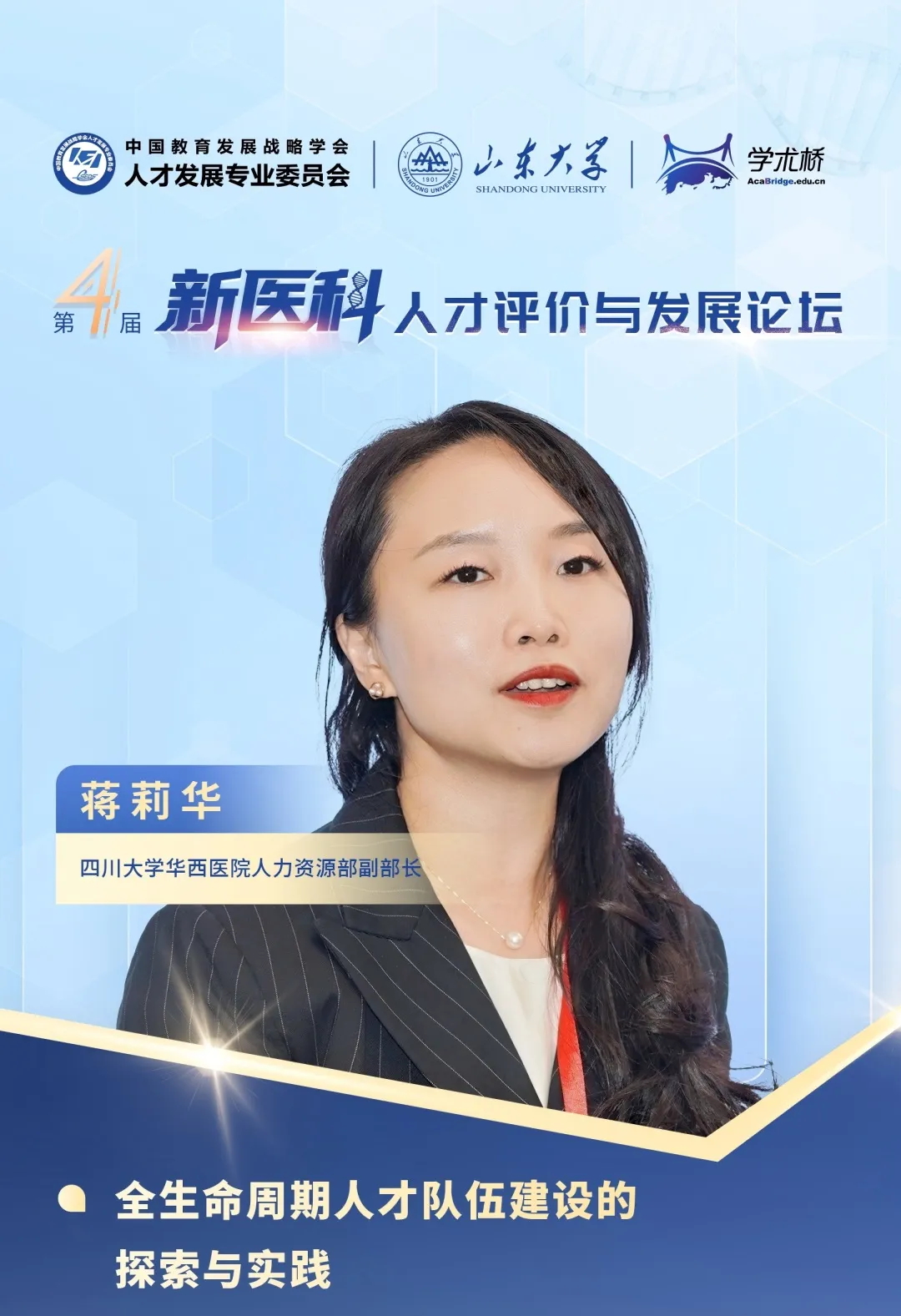 四川大學華西醫院人力資源部副部長蔣莉華系統闡述了四川大學華西醫院圍繞“全生命周期”理念構建人才隊伍體系所作的實踐。她提到,醫院依據人才成長階段實施精準支持:在“初培期”,通過“啟明星”基金、學術導師制和高質量博士后計劃為青年人才奠基;在“成熟期”與“登峰期”,通過骨干培養、資源傾斜及“終身教授”等制度,孵化“國字號”與領軍人才。整個人才體系輔以“分層分類、能上能下”的考核評價華西模式,破除“四唯”,系統性地“筑高原、建高峰”,支撐國家醫學中心與世界一流醫院建設。