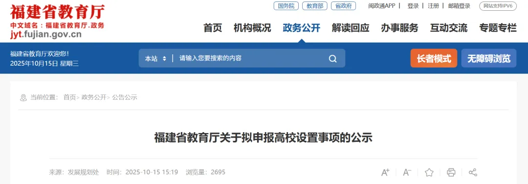 10月15日,福建省教育廳發布《關于擬申報高校設置事項的公示》,擬向教育部(省政府)申報廈門理工學院更名為廈門理工大學、在福州職業技術學院的基礎上建立福州職業技術大學。