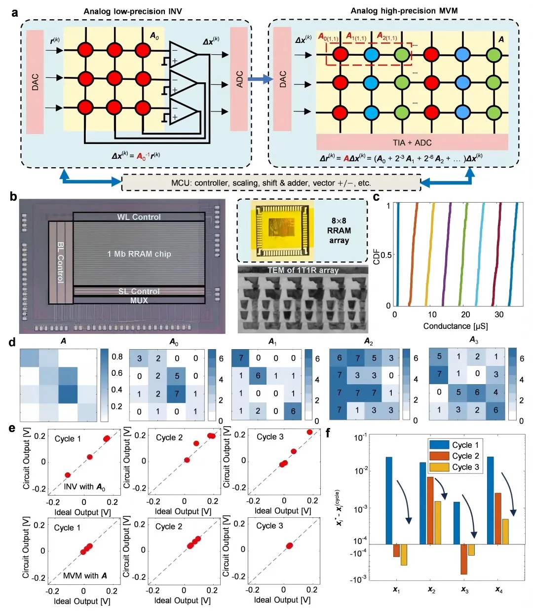 面對這一挑戰,研究團隊選擇了一條融合創新的道路,他們通過新型信息器件、原創電路和經典算法的協同設計,首次實現了在精度上可與數字計算媲美的模擬計算系統,將傳統模擬計算的精度提升了五個數量級。“我們研發的新方案在保持模擬計算低復雜度優勢的同時,實現了與數字FP32處理器相媲美的計算精度。團隊還提出了塊矩陣模擬計算方法,像拼圖一樣將大問題分解到多個芯片上協同解決,成功突破了模擬計算的規模限制,實驗實現了16×16矩陣方程的求解。”