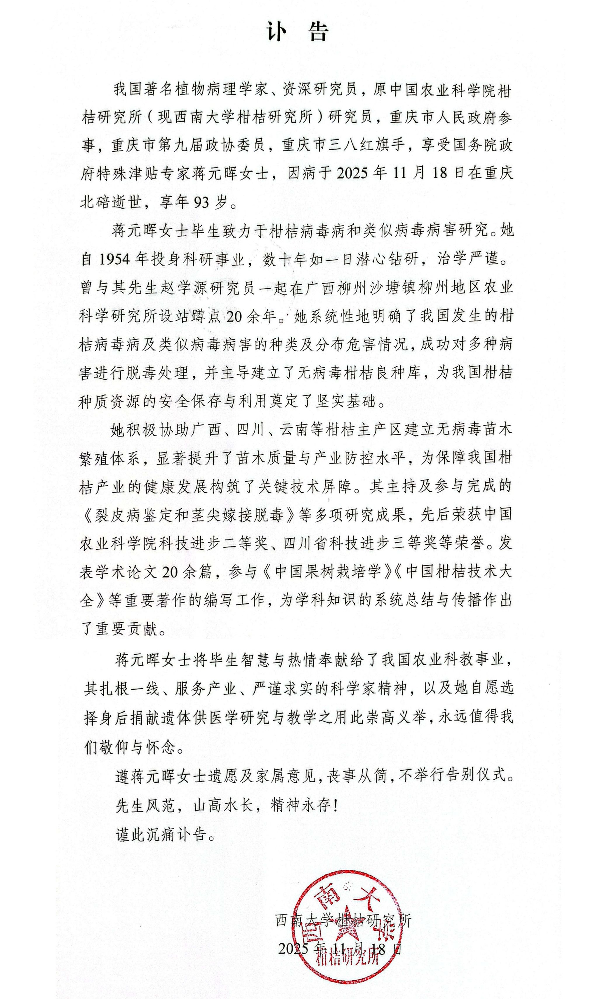 11月18日,西南大學柑桔研究所發布訃告:我國著名植物病理學家、資深研究員,原中國農業科學院柑桔研究所(現西南大學柑桔研究所)研究員,重慶市人民政府參事,重慶市第九屆政協委員,重慶市三八紅旗手,享受國務院政府特殊津貼專家蔣元暉女士,因病于2025年11月18日在重慶北碚逝世,享年93歲。