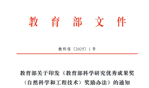 近日,從多所高校官網處獲悉,教育部印發《教育部科學研究優秀成果獎 (自然科學和工程技術)獎勵辦法》的通知。本辦法自2025年12月1日起施行,2019年11月印發的《高等學校科學研究優秀成果獎(科學技術)獎勵辦法》(教技〔2019〕3號)同時廢止。
