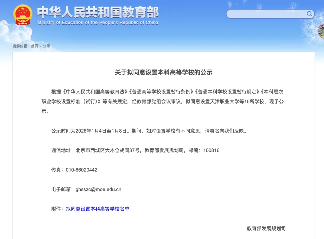 1月4日,教育部發布《關于擬同意設置本科高等學校的公示》。根據《中華人民共和國高等教育法》《普通高等學校設置暫行條例》《普通本科學校設置暫行規定》《本科層次職業學校設置標準(試行)》等有關規定,經教育部黨組會議審議,擬同意設置天津職業大學等15所學校,現予公示。