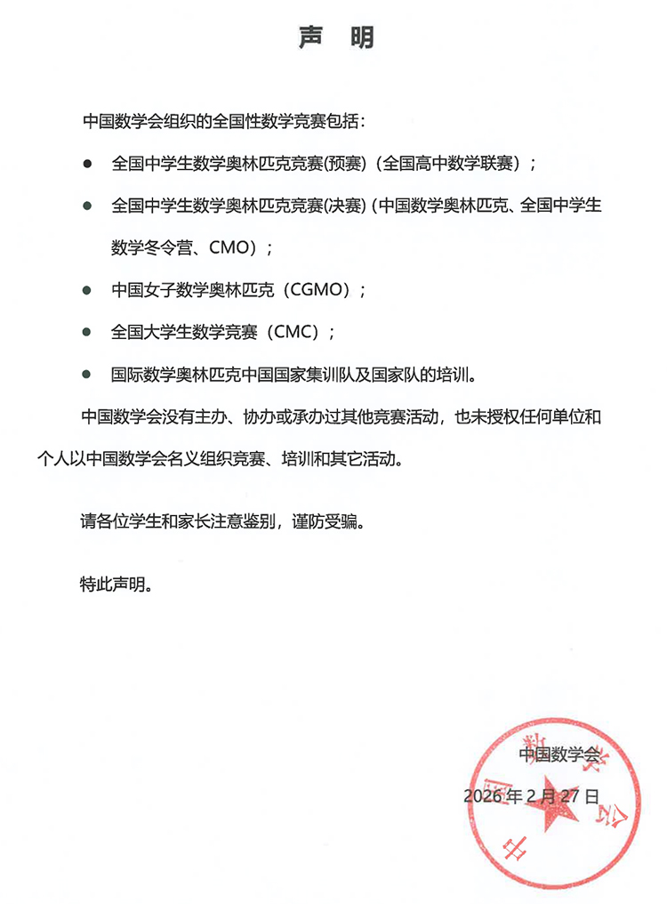 中國數學會2月27日發布聲明,明確除5項全國性數學競賽外,中國數學會沒有主辦、協辦或承辦過其他競賽活動,也未授權任何單位和個人以中國數學會名義組織競賽、培訓和其它活動。提醒學生和家長注意鑒別,謹防受騙。
