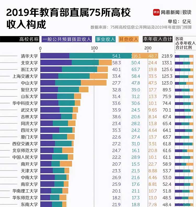 其他著名高校也類似,國家財政直接撥款占比并不高,主要還是學校自籌的經費。