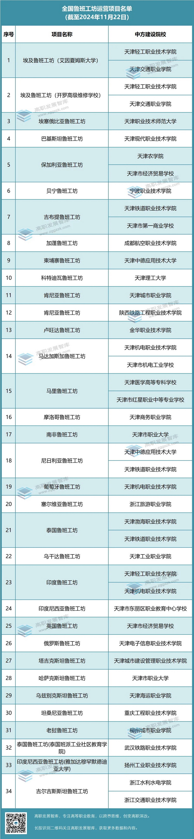 據高職發展智庫統計,截至2024年11月22日,共有34個項目被中國教育國際交流協會認定為魯班工坊運營項目。其中,全國共有24所高職院校的32個項目入選。
