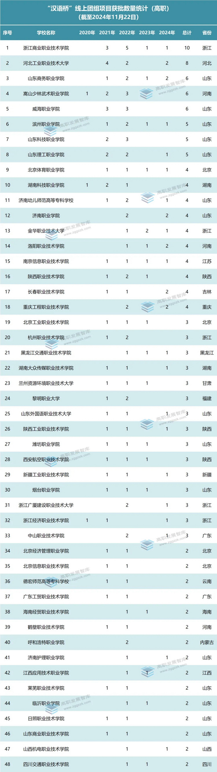 近日,高職發展智庫對漢語橋團組在線體驗平臺高職院校承辦的項目進行了統計。截至2024年11月22日,全國共有101所高職院校獲批“漢語橋”線上團組項目224項。