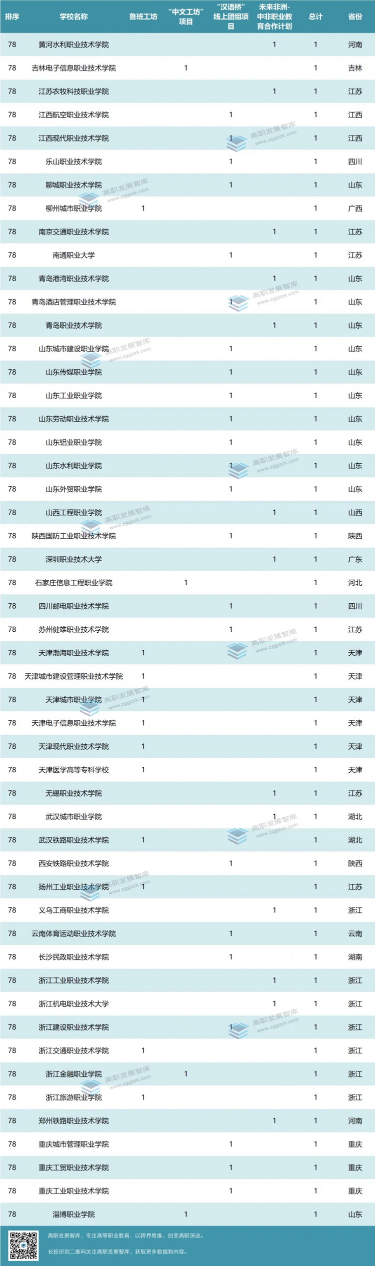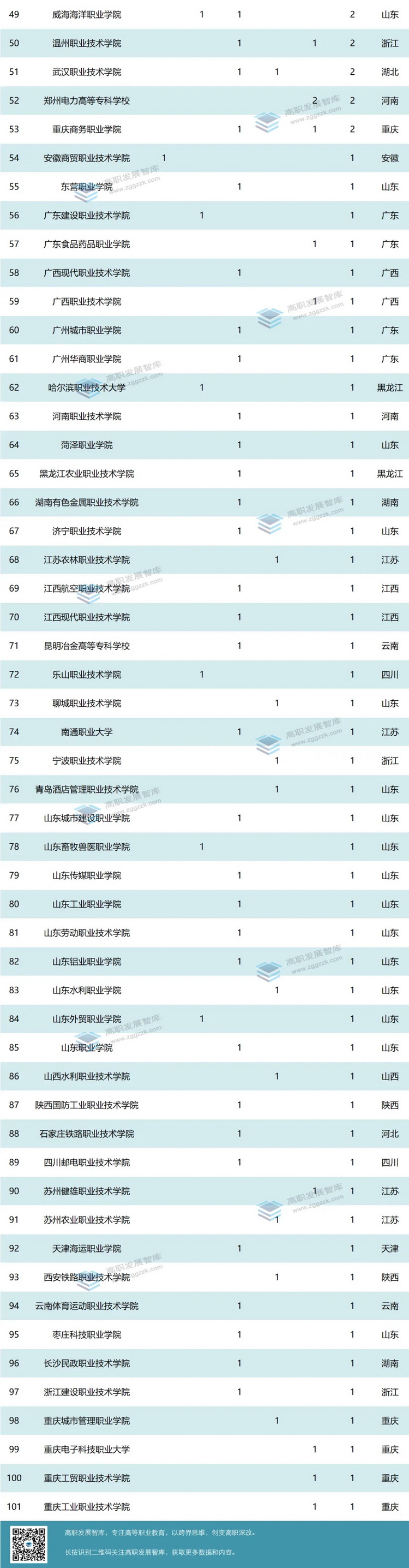 入選數量排在全國前十的高職院校還有:山東理工職業學院、山東商務職業學院、重慶工程職業技術學院、濱州職業學院、嵩山少林武術職業學院、威海職業學院、濰坊職業學院。