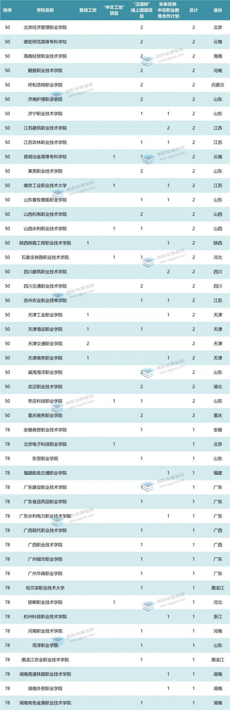 高職發展智庫對“職教出海”四大品牌項目魯班工坊、“中文工坊”項目、“漢語橋”線上團組項目、未來非洲-中非職業教育合作計劃進行了匯總統計,全國共有148所高職院校入選。