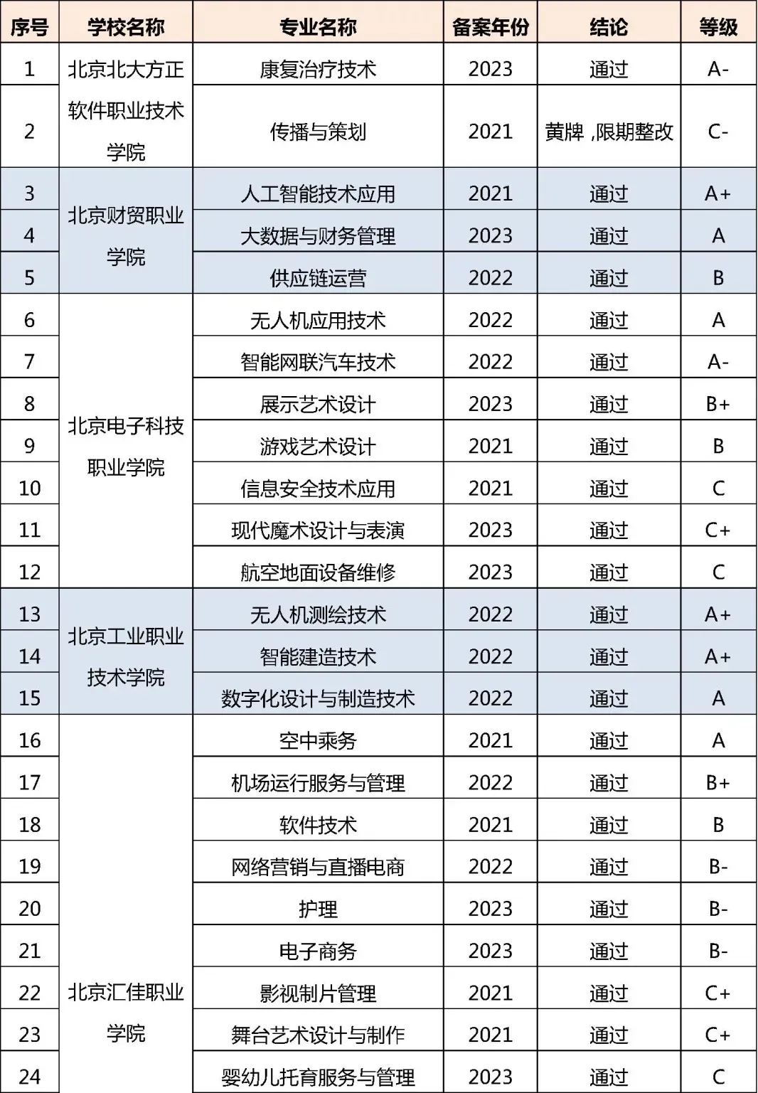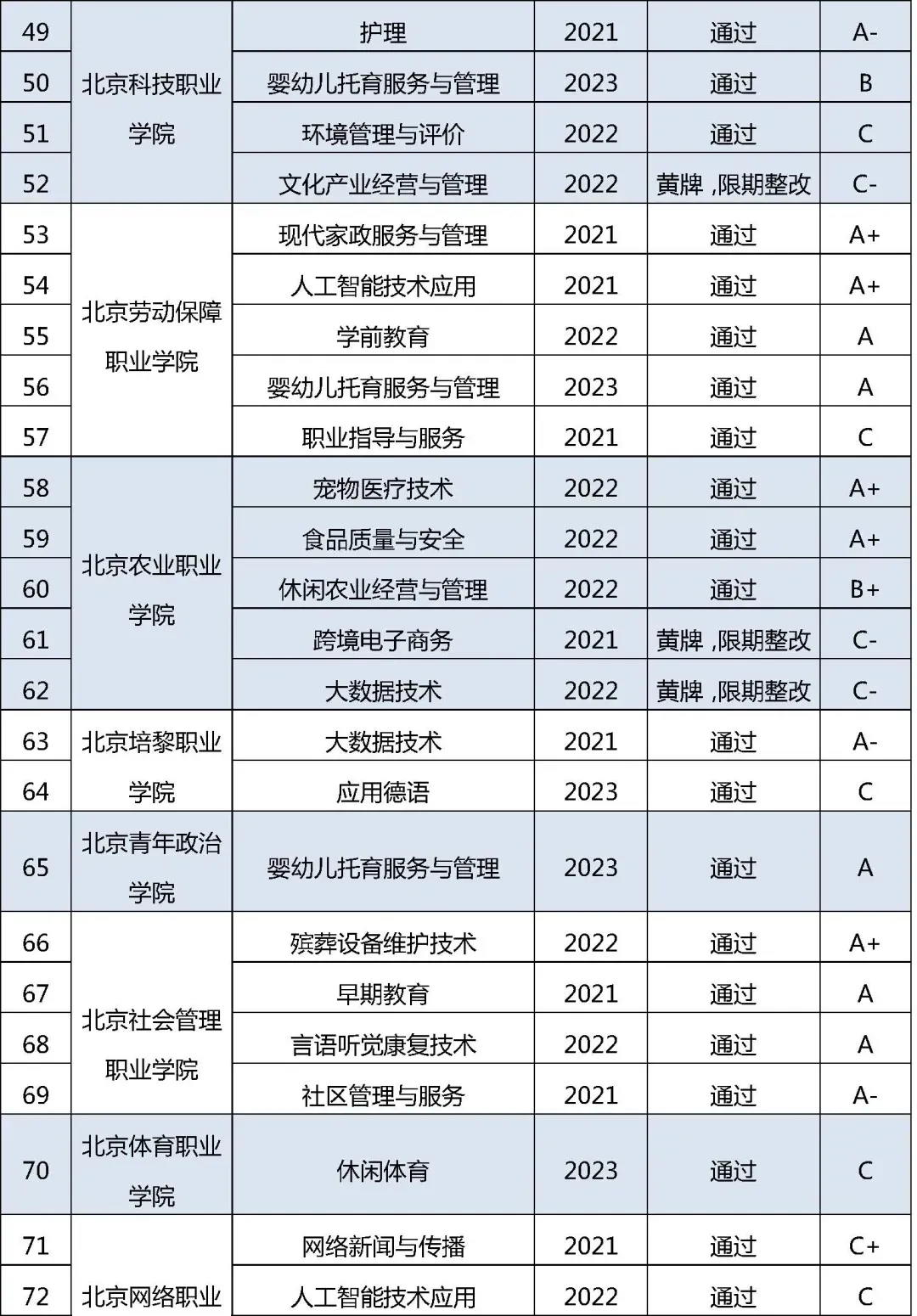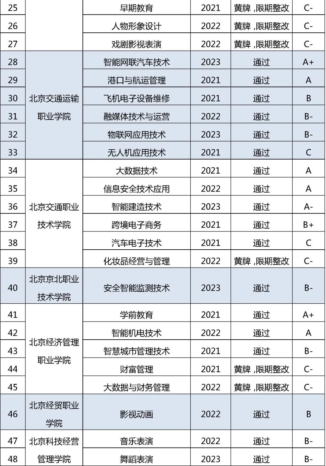 近日,2024年北京市職業院校近三年新增專業質量監測評價結果公布。評價結果顯示,36所職校163個專業予以通過,17所職校的28個專業給予“黃牌、限期整改”,要求限期整改。其中,9所高職的13個專業為“黃牌、限期整改”。