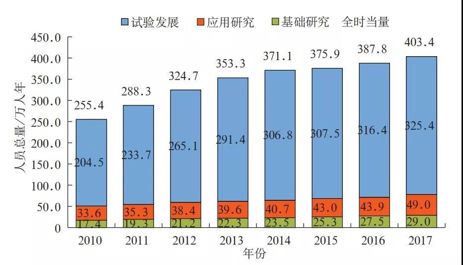 三類研究類型的R&D人員數量均持續增加。2017年我國R&D人員(全時當量)為403.4萬人年,其中從事試驗發展的人員有325.4萬人年,占80.7%;從事應用研究的人員為49.0萬人年,占12.1%;從事基礎研究的人員為29.0萬人年,占7.2%。2010-2017年,三類研究類型的R&D人員數量均有不同程度的增長,其中從事基礎研究的R&D人員增速最快。(見圖1)。