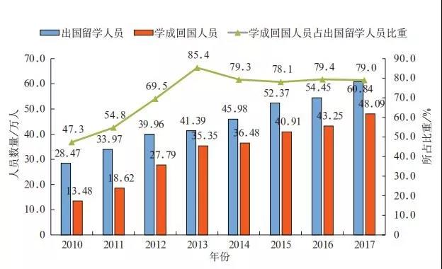 全球人才吸引力排名上升四個位次。根據《2017—2018年全球競爭力報告》顯示,在各國對人才吸引力排行中,中國居第23位,比2014—2015年的第27名前進了4名。我國留學生回流加速,對外國留學生吸引力增大。2017年出國留學人數增加6.39萬人,增長了11.7%;留學回國人數增加了4.84萬人,增長了11.2%。從2011年開始,中國留學回國人員數量占出國留學人員數量的比例超過半數,更多的出國留學人員選擇了回國發展。2010—2017年留學回國人員總數達263.97萬人,年均增長19.9%,高于出國留學人員11.5%的年均增長率(見圖2)。我國成為亞洲最大留學目的國,生源層次顯著提升,2016年在華留學生中碩博研究生人數達6.4萬人,占總人數的14.4%。“一帶一路”國家在華留學生數量增長明顯,2016年“一帶一路”沿線64個國家中共207746人在華留學,同比增幅達13.6%。