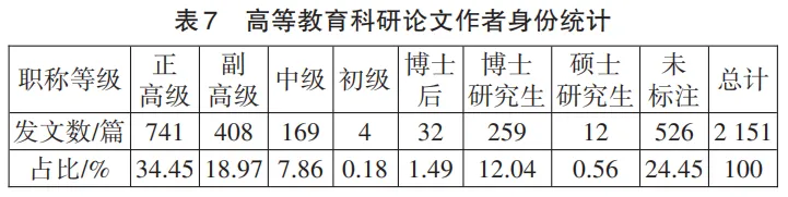 在統計作者署名情況的2151篇論文中,兩人聯合署名是占比最高的署名形式,其次為單獨署名。統計發現,聯合署名的總占比達67.04%,這顯示出高等教育科研活動中合作研究已經成為主流方式,呈現出有組織科研的雛形。高等教育學科發展進入成熟化階段,跨學科、跨主體的研究越來越深入,采用多樣化的研究方法、多學科的研究視角、多主體的信息采集方式使得不同背景的研究者組建起復合型研究團隊開展更深入、更廣闊的有組織研究。(見表6)以團隊形態開展的高等教育研究主題值得進一步分析挖掘,以反映高等教育科研的深層次結構。