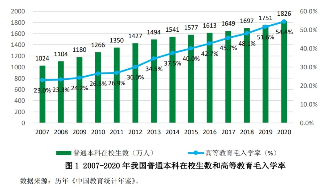 圖1呈現了2007—2020年我國高等教育毛入學率和普通本科高校的在校生數據。2007—2020年,高等教育毛入學率 逐年提高,2019年實現了高等教育普及化(51.6%),2020年繼續提高到54.4%。(注:高等教育毛入學率統計中的高等教育在學總規模不僅包括普通高等教育本專科在校生數、研究生在校生數,還包括成人本專科折合在校生數、成人夜大在校生數等。)我國普通本科在校生規模逐年增長,從1024萬人增加到1826萬人。