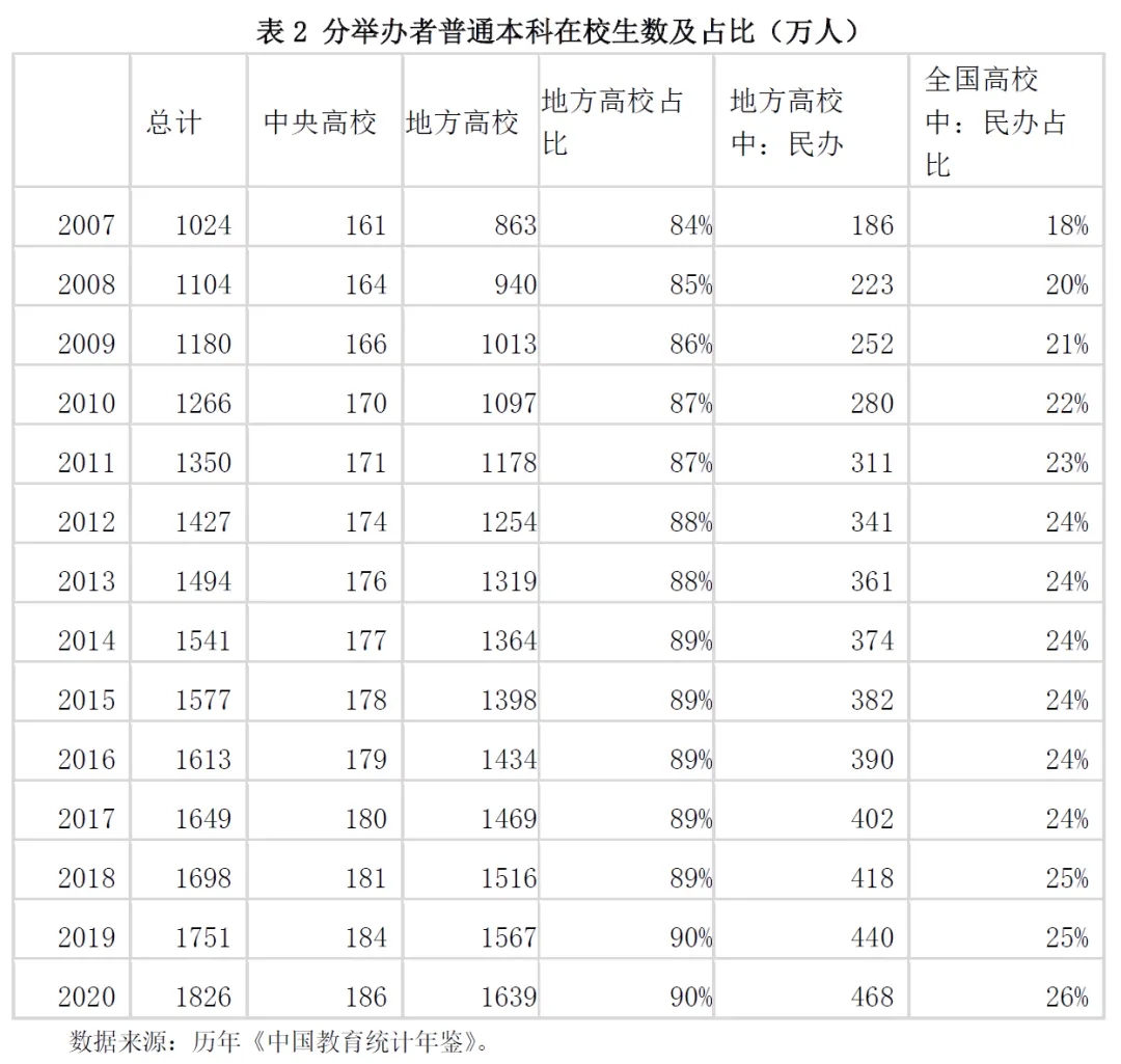 從學校數來看(表1),2007—2020年,中央高校增加了8所,地方高校增加了522所(占比從86%增加到91%);地方高校中,民辦高校增加了413所(在全國高校中占比從4%增加到35%)。從在校生數來看(表3),中央高校增加了25萬人,地方高校增加了776萬人(占比從84%增加到90%);地方高校中,民辦高校增加了282萬人(在全國高校學生數中占比從18%增加到26%)。總之,在全國普通本科高校中,無論是學校數還是在校生數,地方普通本科高校都占90%及以上,在規模上占據主體地位。