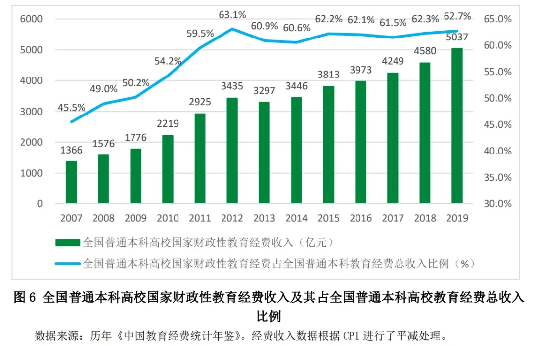 為進一步加大地方高等教育財政投入,使地方高校更好地承擔起實施科教興國戰略和人才強國戰略、建設創新型國家的歷史使命,在高等教育以大規模擴招為特征的外延式發展轉入以提高質量為特征的內涵式發展階段后,中央政府逐步進行政策調整,在增加中央政府對地方高校(地方所屬公辦普通本科高校)支持的同時,提高地方政府投入高等教育的積極性。2010年財政部、教育部出臺《關于印發<中央財政支持地方高校發展專項資金管理辦法>的通知》(財教〔2010〕21號),在原“中央與地方共建高等學校專項資金”的基礎上,設立支持地方高校發展專項資金,支持地方高校的重點發展和特色辦學。2010年11月30日,財政部、教育部發布《關于進一步提高地方普通本科高校生均撥款水平的意見》(財教〔2010〕567號),要求各地要根據高校合理需要,制訂本地區地方高校生均撥款基本標準。在此基礎上,結合財力情況、物價變動水平、高校在校生人數變化、工資標準調整等因素,建立地方高校生均撥款動態調整機制,逐步提高生均撥款水平。原則上,2012年各地地方高校生均撥款水平不低于12000元。2010年提高地方普通本科高校生均撥款水平的政策有效地確保了各省份及省級以下政府對地方高等教育的財政投入。此后,中央高校和地方高校之間差距開始逐步縮小。2010年,地方普通高校生均預算內教育經費支出占中央普通高校生均預算內教育經費支出的比例從42.68%增至46.94%,2012年升至60.53%,此后雖有下降,但一直維持在55%左右,2019年開始上升,2020 年達到 66.57%。