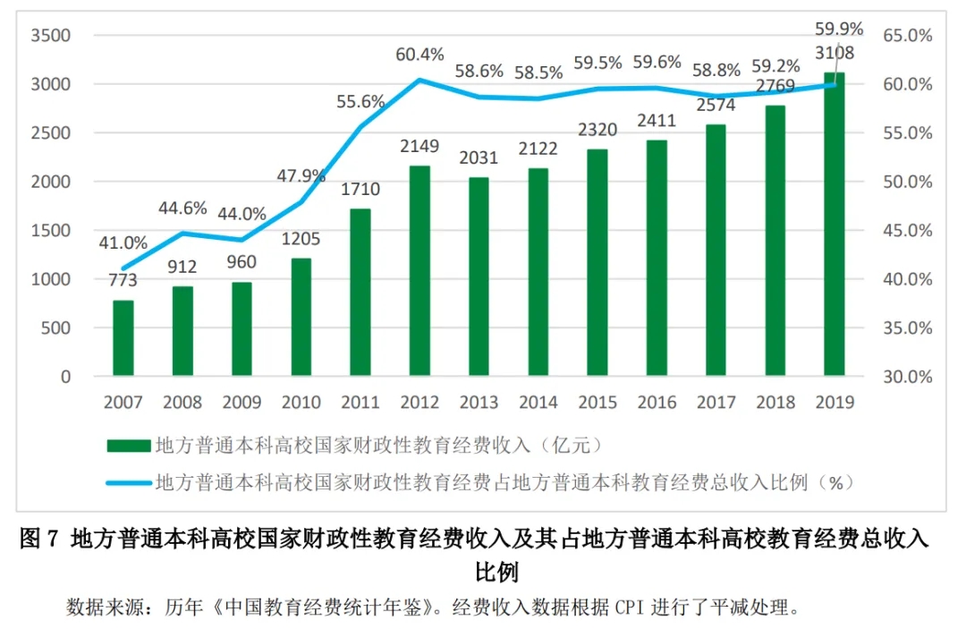 圖6和圖7顯示的是2007—2019年全國和地方普通本科高校教育經費總收入中國家財政性教育經費占比的變化情況(含民辦高校)。從占比的變化趨勢來看,無論是全國高校還是地方高校,2007年到2012年都呈明顯的上升趨勢,2012年達到頂點之后,波動幅度不大。具體來看,全國普通本科高校的財政性教育經費占比,從2007年的45.5%上升到2012年的63.1%,之后穩定在61%~62%左右。地方普通本科高校的財政性教育經費占比,從2007年的41.0%上升到2012年的60.4%,之后一直穩定在58%~60%。可見,與2007年相比,全國普通本科高校尤其是地方普通本科高校財政性教育經費占比有了很大增長。
