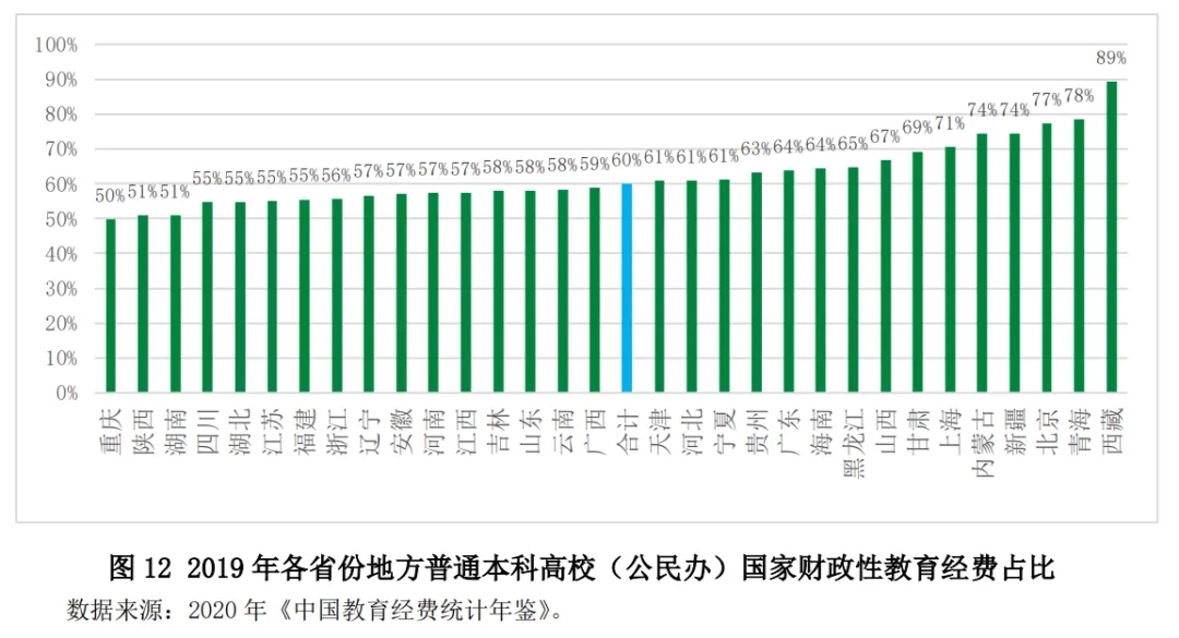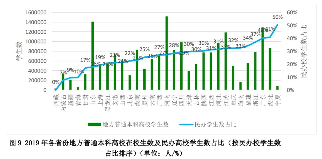 此外,本報告關于各省份高校間差異主要分析的是地方教育部門和其他部門辦的703所普通本科高校,不包括民辦普通本科高校,因此不能反映各省份地方普通本科高校的全貌。民辦高校在地方屬高校中占比38%,而且在各省份的分布差異很大,值得專門研究。