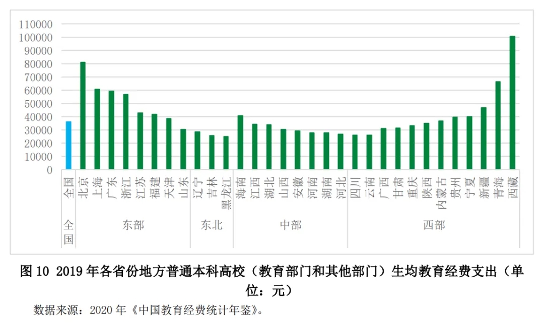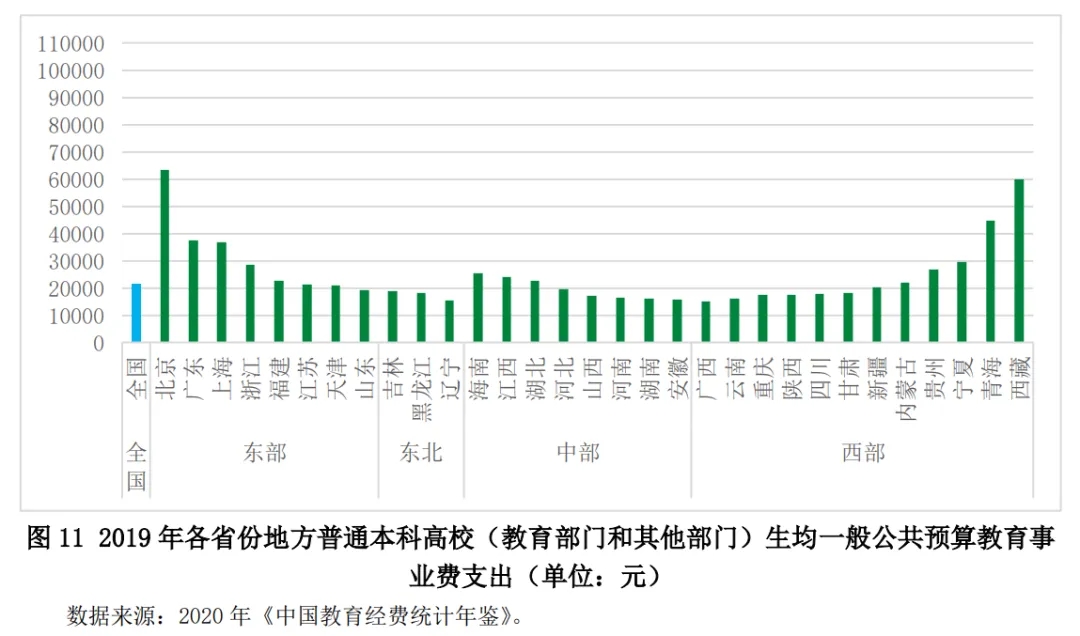 圖10顯示的是2019年各省份地方公辦普通本科高校生均教育經費支出。東部的北京、上海、廣東、浙江等地,以及西部的青海、西藏等,生均教育經費支出較高。東北地區、西部的四川、云南等地,生均教育經費支出較低。