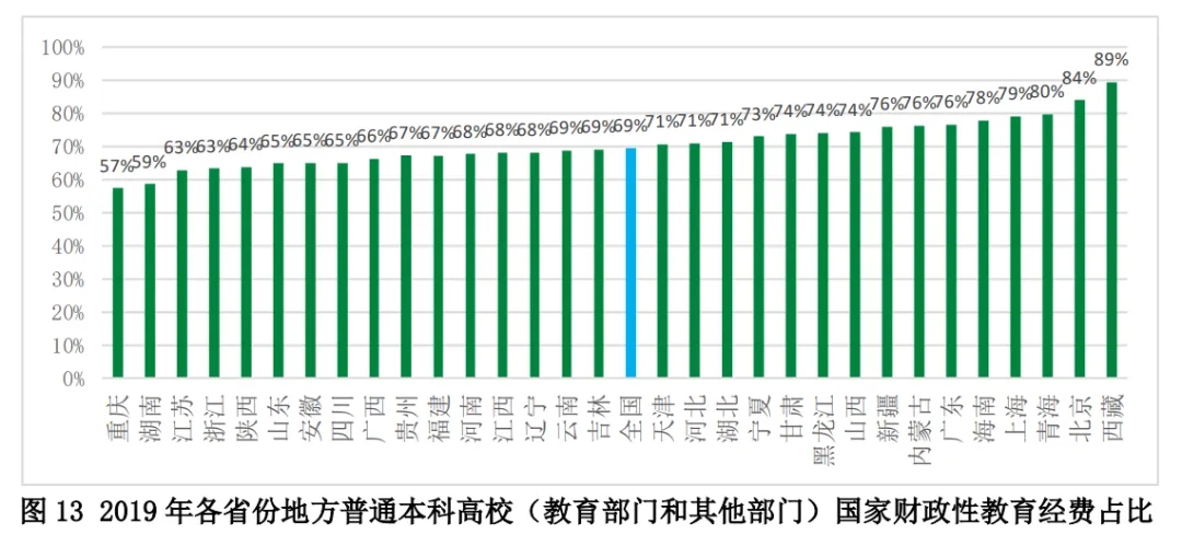 2019年,地方普通本科高校(公民辦)教育經費收入中國家財政性教育經費占比的全國平均水平約為60%,各省份存在一定的差異(見圖12)。占比高于70%的省份以西部為主,包括內蒙古(74%)、青海(78%)等,東部的上海(71%)、北京(77%)占比也較高;占比低于55%的省份主要是中西部省份,包括中部的湖北(55%)、湖南(51%),西部的四川(55%)、陜西(51%)、重慶(50%),此外,東部的浙江(56%)、福建(55%)、江蘇(55%)占比也較低。