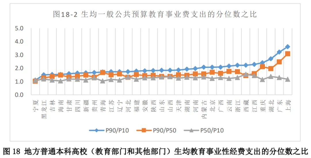 各省份高校間的總體差異體現在不同層次高校之間,我們用不同分位數之比來反映。圖18顯示的是各省份生均教育事業性經費支出、生均一般公共預算教育事業費支出的不同分位數之比。