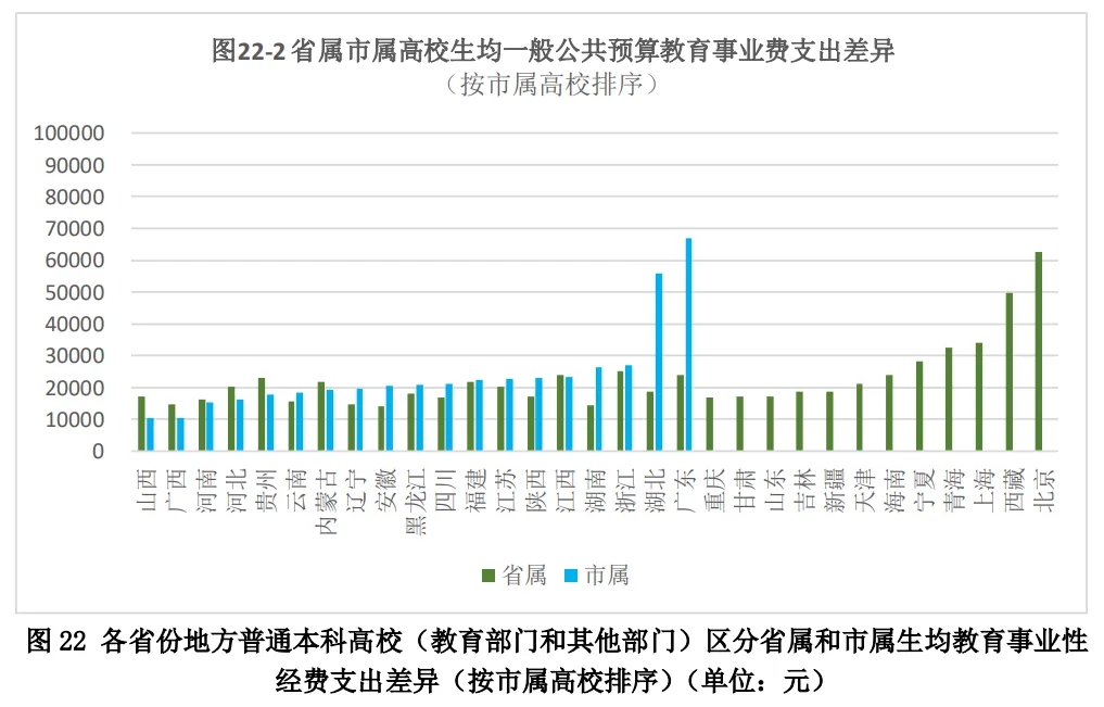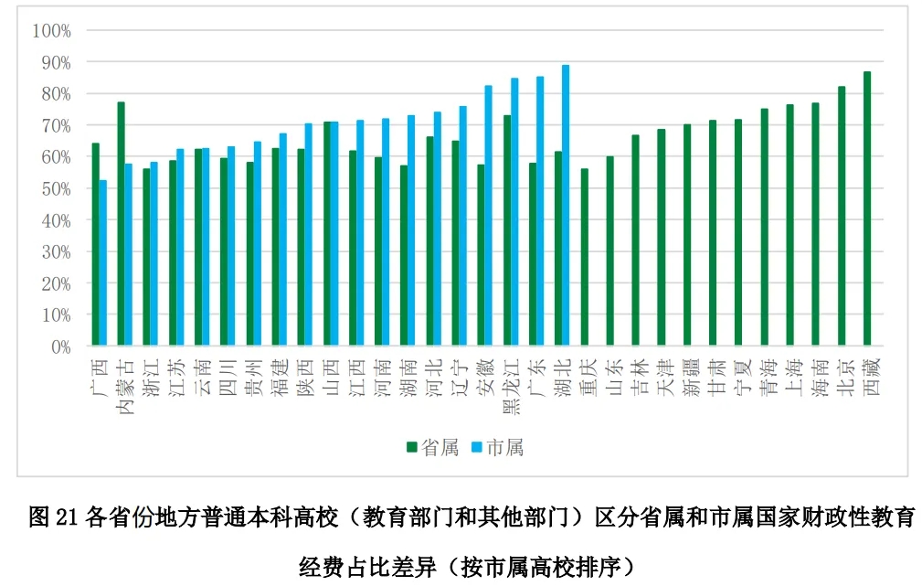 第二,報告分析了各省份的省屬高校和市屬高校之間的投入差異,而市屬高校和市屬高校在校生數占比僅為13%和10%,有些省份的市屬高校和在校生數少之又少,目前的分析僅停留在國家財政性教育經費占比、生均教育經費支出等指標的比較,尚未深入分析。