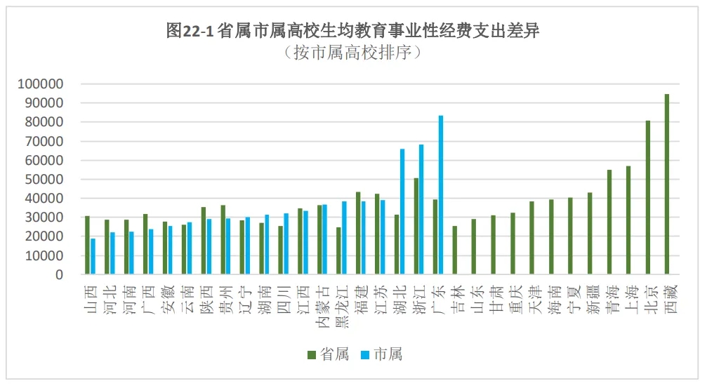 生均一般公共預算教育事業費支出的情況則有所不同(圖22-2)。廣西、山西、河北、內蒙古、貴州這5個省份是省屬高校高于市屬高校,其中,山西省屬和市屬高校的生均一般公共預算教育事業費支出分別是17226元和10367元,貴州是22992元和17845元,省屬和市屬最大相差6859元。河南、福建、江西這3個省的省屬市屬高校相差無幾。除此之外的其他11個省份是市屬高校高于省屬高校,廣東、浙江、湖北、黑龍江等省份仍屬這一類。其中,廣東市屬和省屬高校的生均一般公共預算教育事業費支出分別是66810元和23877元,湖北是55789元和18668元,湖南是26427元和14473元,陜西是22940元和17198元,市屬和省屬最大相差4萬多元。相較而言,這些省份市屬高校獲得的財政支持力度較大。