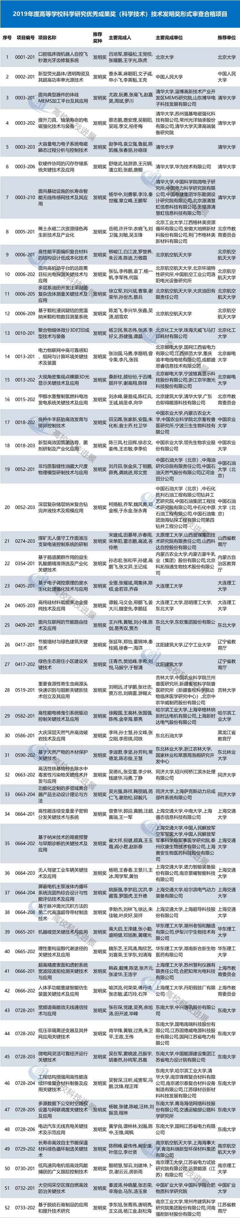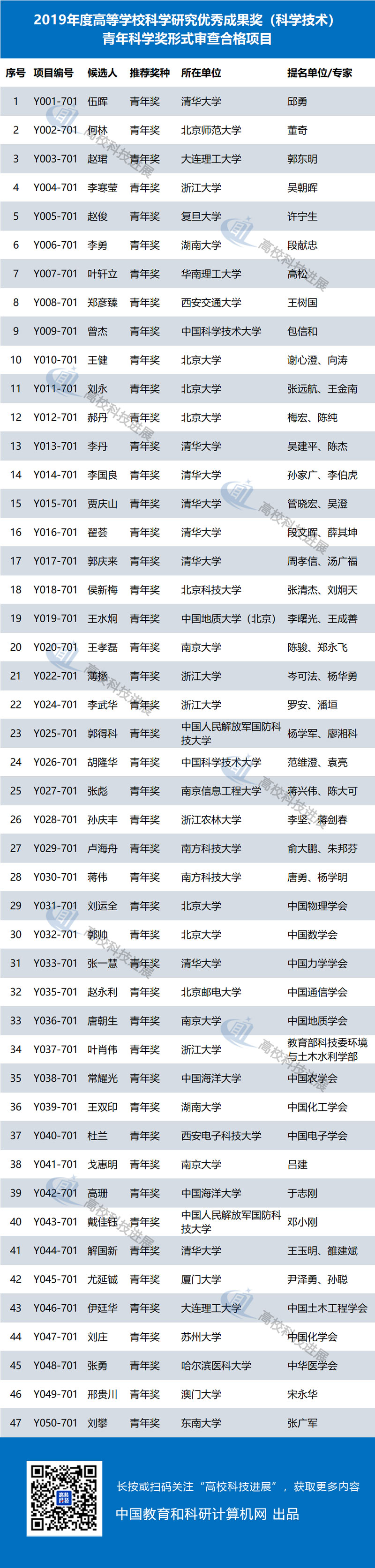 7月22日,2019年度高等學校科學研究優秀成果獎(科學技術)推薦/提名工作已結束。教育部科技司組織對候選項目/候選人進行了形式審查,確定形式審查合格941項/人(含專用項目32項),不合格92項,形式審查過程中,推薦/提名單位或專家提出撤銷推薦/提名13項。形式審查合格項目中,自然科學獎347項,技術發明獎125項(通用項目109項,專用項目16項),科學技術進步獎422項(通用項目406項,專用項目16項),青年科學獎候選人47人。
