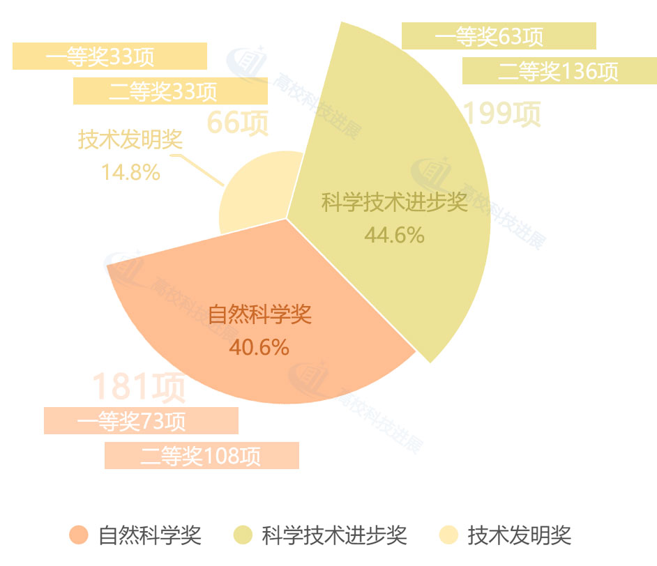 從授獎等級情況來看,在通過評審的項目中,高校獲評一等獎和二等獎的項目數量分別為169項、277項。其中,自然科學獎獲評一等獎和二等獎的項目分別為73項、108項,科學技術進步獎獲評一等獎和二等獎的項目分別為63項、136項,技術發明獎獲評一等獎、二等獎的項目數均為33項,自然科學獎獲評一等獎的項目數量高于科學技術進步獎和技術發明獎。