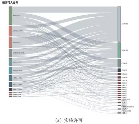 江蘇省和廣東省是北京高校最重要的技術輸出地,分別位于長三角地區和珠三角地區, 這兩個省也是我國高校專利申請大省,但江蘇省以被許可專利為最多,廣東省以受讓專利為最多。