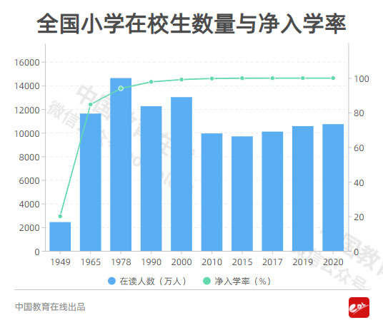 2020年,全國共有普通小學15.80萬所,在校生10725.35萬人。小學學齡兒童凈入學率99.96%,接近100%。