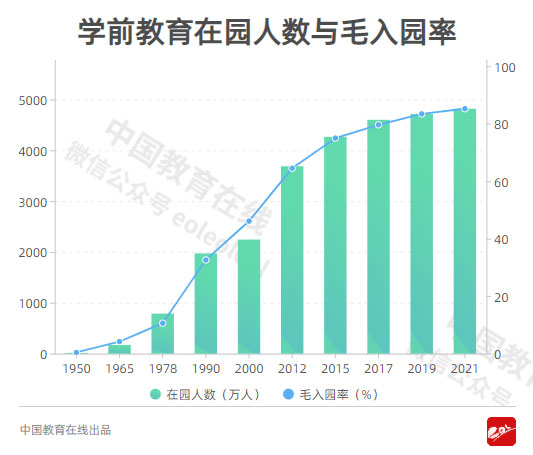 1950年,我國幼兒園數1799所,在園幼兒僅為14萬人,毛入園率0.4%。