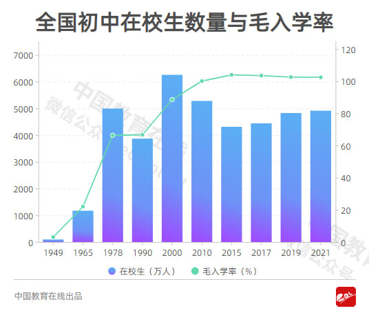 建國初期的中國,中學在校生不超過100萬人,為95萬人,毛入學率3.1%。1978年,全國初中在校生人數達到4995萬人,毛入學率66.4%。