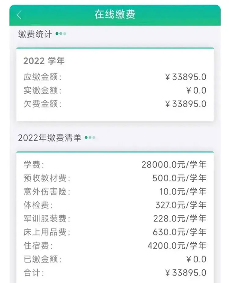 根據網友曬出的繳費單,某地方民辦本科學校學費高達28000/學年,總費用合計33895/學年,其中住宿費就4200。