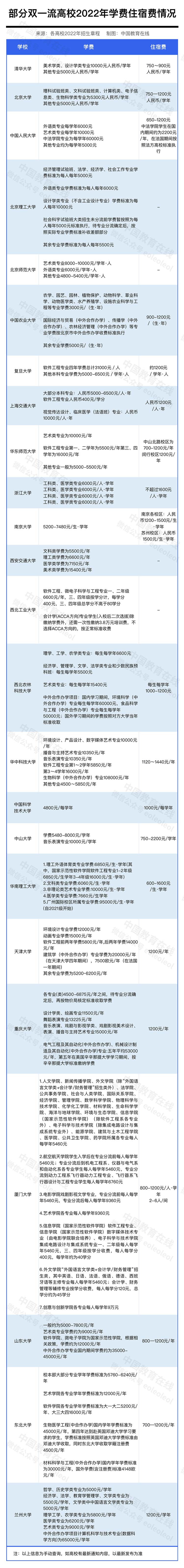 從中國教育在線統計的部分“雙一流”高校2022年學費情況來看,最低的是中國農業大學農學相關專業,學費僅3000元每學年,這個數字基本已經低于大部分高中的學費了。藝術類專業則較其他專業較高,通常在8000-15000元每年。