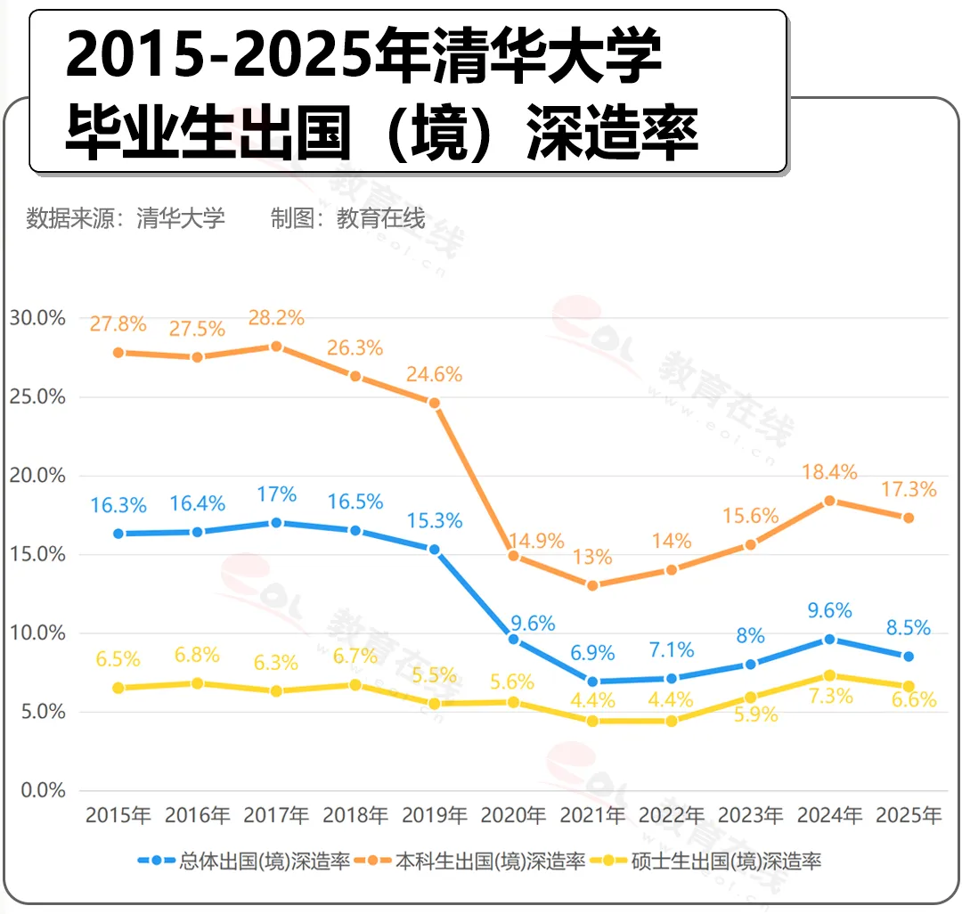 近日,清華大學公布2025屆畢業生去向情況。一組數據刷屏全網:2025屆畢業生出國(境)深造比例8.5%。近十年,清華畢業生平均出國(境)深造比例為10.0%。